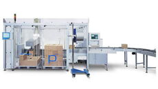 Palletizer P 5020 is a machine that loads packaged products onto pallets. The GMP-compliant concept is geared to maximum compatibility, flexible adaptation to customer requirements as well as optimum performance and comfort. The P 5020 picks up packed cases, open trays, display packs, shrink-wrapped bottle bundles or other forms of products and accurately stacks them on pallets.